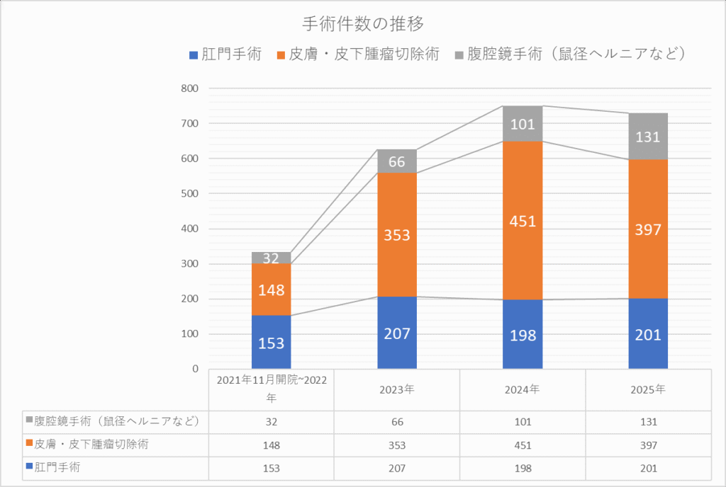 当院は2021年11月1日より診療を開始して約4年が経過しました。多くの皆様のご支援のもと、2025年1月1日~12月末日までに729件の日帰り手術を無事に行うことができました。内訳は肛門手術201件(痔核、痔瘻、裂肛、直腸脱手術)(血栓摘出や肛門周囲膿瘍切開排膿などの外来手術約100件を除く)、腹腔鏡手術131件(鼠径ヘルニア、胆石症など)、皮膚・皮下腫瘤切除(ガングリオン切除やイボ・ホクロなどの自費切除を含む)397件でした。関係者の方々に心から感謝を申し上げます。また、患者様には大崎市内や宮城県北の栗原市、登米市、美里町、涌谷町、加美町、大郷町、大和町、色麻町、石巻市、東松島市、気仙沼市、富谷市、仙台市、一関市、白石市、角田市、山形県村山市などからも手術のために受診して頂きました。